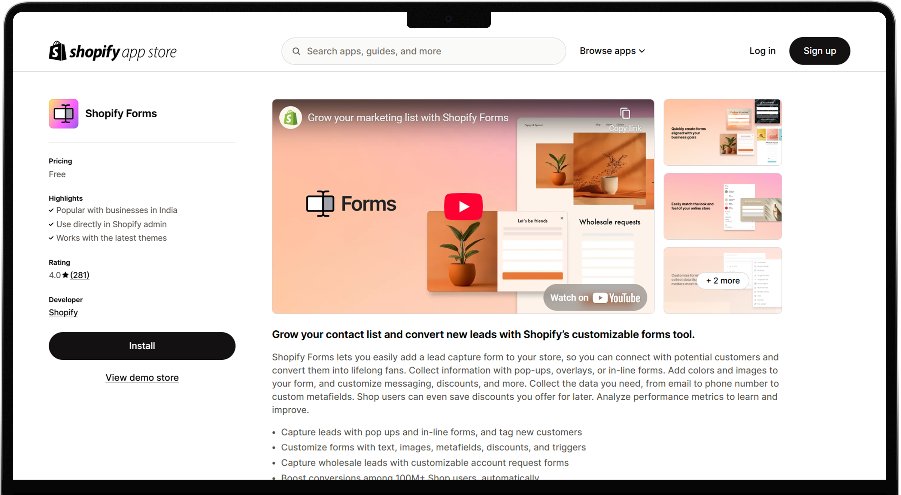 Shopify Forms lets you create lead forms on your store and connect with potential customers. It allows you to collect information with pop-up, overlays, or in-line forms and add colours and images to your form, discounts, and customize messages. Collect data from emails to phone numbers to custom metafield and analyze performance metrics to learn and improve.